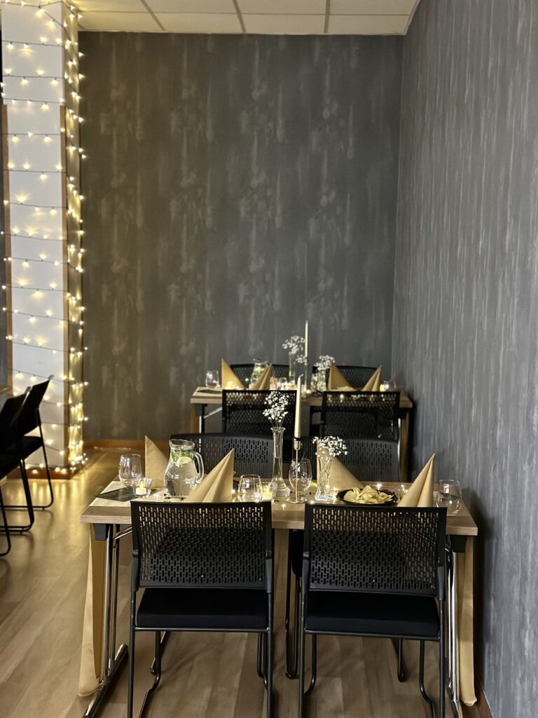 Restaurace: Středové aranžmá, girlandy na stěnách a tematické osvětlení.
